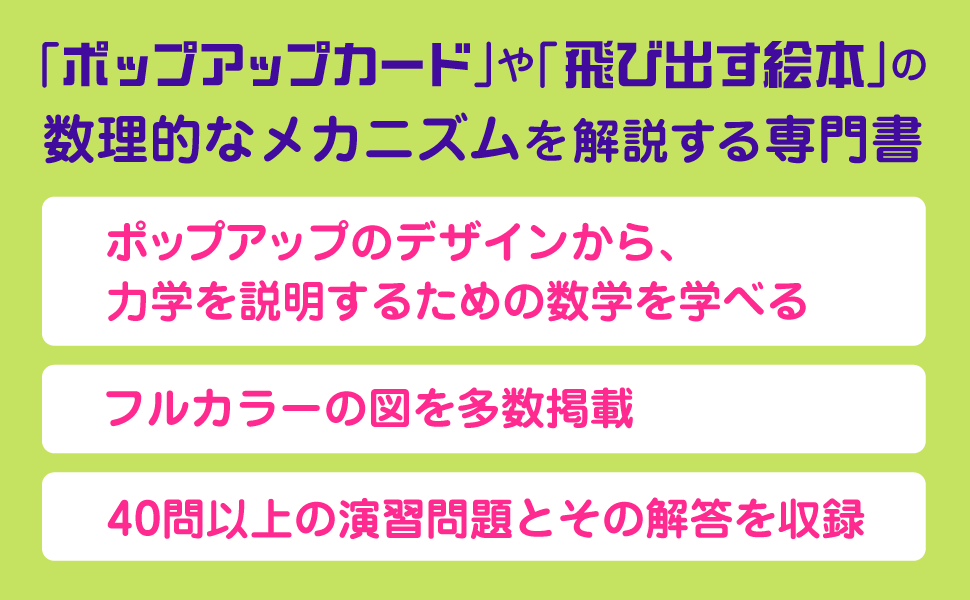 Joseph O’Rourke氏の著書“Geometric Folding Algorithm”、“How to Fold It”の続編的書籍。今回の “Pop-up Geometry” は、“How to Fold It”と同様、初学者や入門者向けに優しく書き下した本ですが、扱っているテーマは “How to Fold It”とは違って、飛び出す絵本、あるいはしかけ絵本と呼ばれる分野のメカニズムを数理的に扱っています。