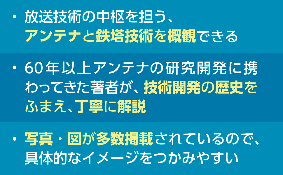 アンテナは電磁気学を基礎にして,通信はもとより,情報,制御計測などの学問に応用され,次々と新しい無線技術を生み出しています.本書は,アンテナと鉄塔建設の現場からマイクロ波鉄塔まで写真,図をふんだんに取り入れて説明し,放送通信技術である各種アンテナと鉄塔技術について述べています。