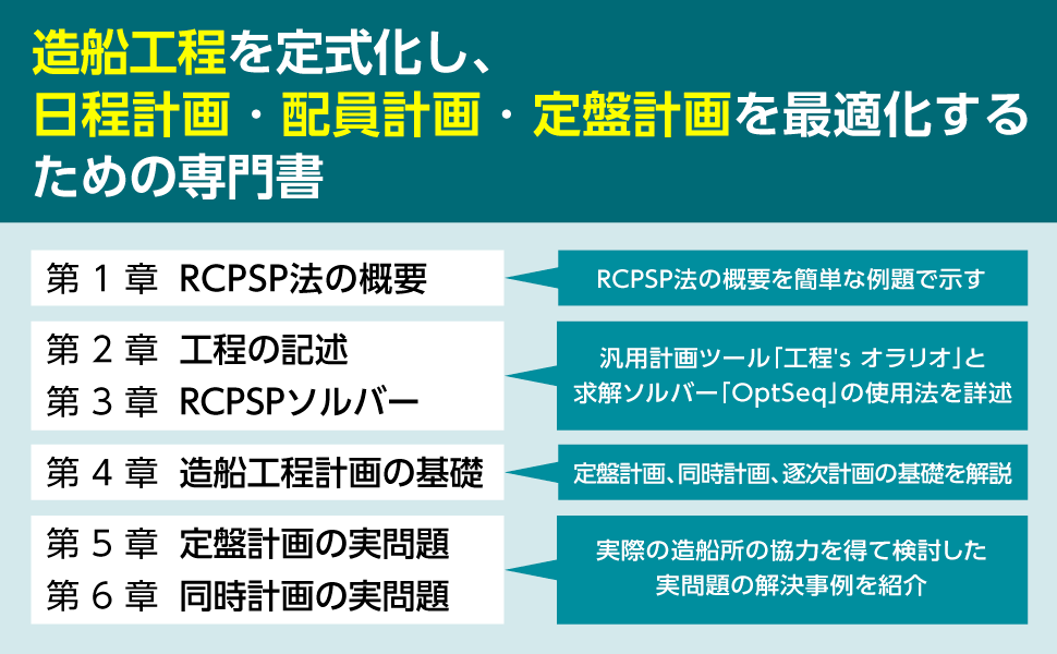 本書は造船業における工程計画担当者へ向けた実用的な指南書です。日程計画、配員計画、定盤計画という複雑な要素を、熟練者の経験だけでなく、計算機による支援で最適化する新しいアプローチを提案しています。そこで用いるのがRCPSP(資源制約付きスケジューリング問題)という手法で、造船工程を数理的に定式化し、専用のソルバーを用いて最適な計画を導き出します。第1章ではRCPSP法の概要を簡単な例題で示し、第2章と第3章では、汎用計画ツール「工程's オラリオ」と、求解ソルバー「OptSeq」の使用法を詳述します。第4章では定盤計画、同時計画、逐次計画の基礎を解説し、第5章と第6章では、実際の造船所の協力を得て検討した実問題の解決事例を紹介します。計画業務の効率化と最適化を実現するための、新たな道筋を示した専門書です。