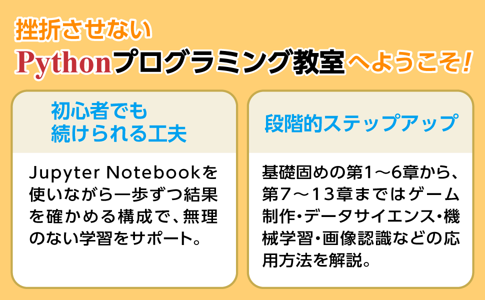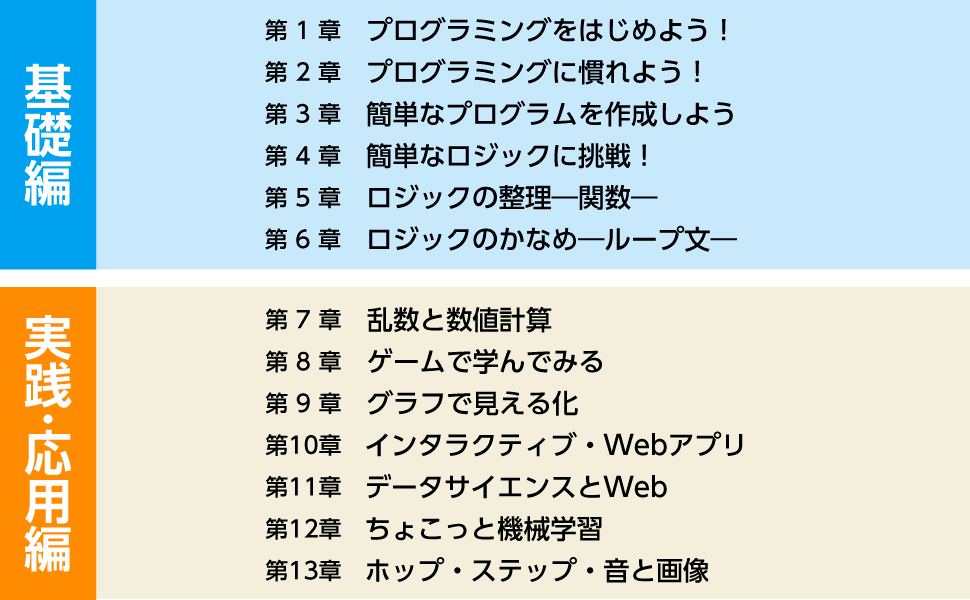 内容は全13章で構成され、前半の第1章から第6章では変数やループ、関数といった基礎を固めます。後半の第7章以降は、乱数を用いたゲーム制作、データ分析、Webアプリ開発、さらには機械学習や画像認識までを網羅したステップアップ方式となっており、段階的に高度なスキルを習得できます。