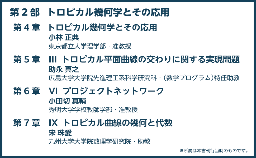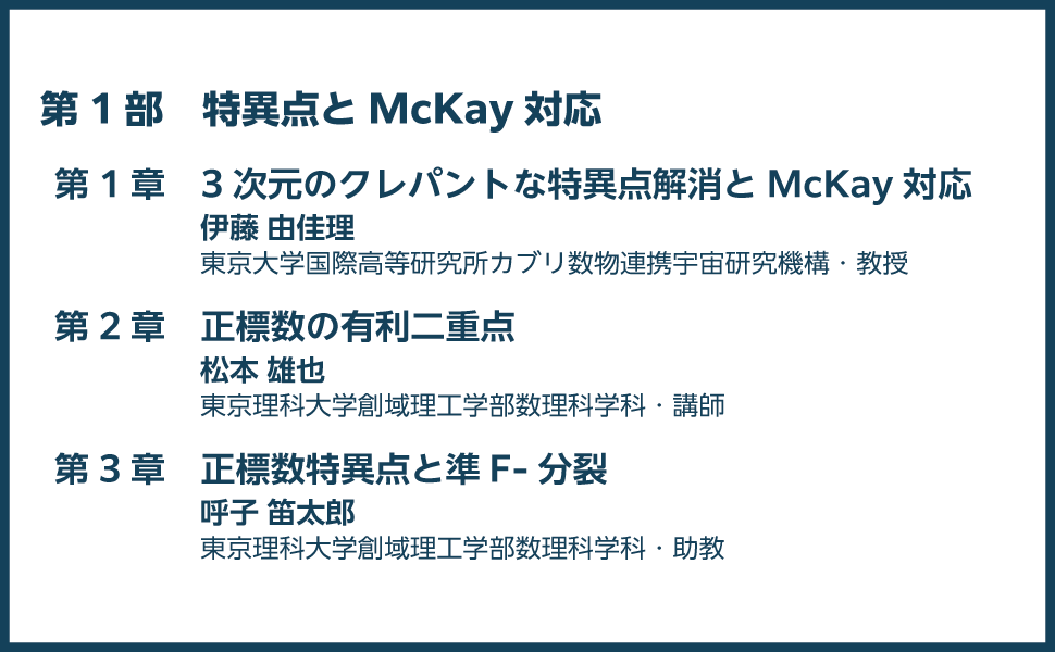 内容は、代数学や幾何学など多分野にまたがる「特異点とMcKay対応」および「トロピカル幾何学とその応用」の二部構成です。第一線で活躍する研究者が、背景から具体的な計算まで丁寧に解説しており、初学者や専門外の方にも読みやすい入門書となっています。