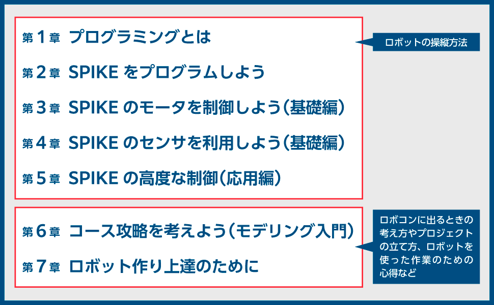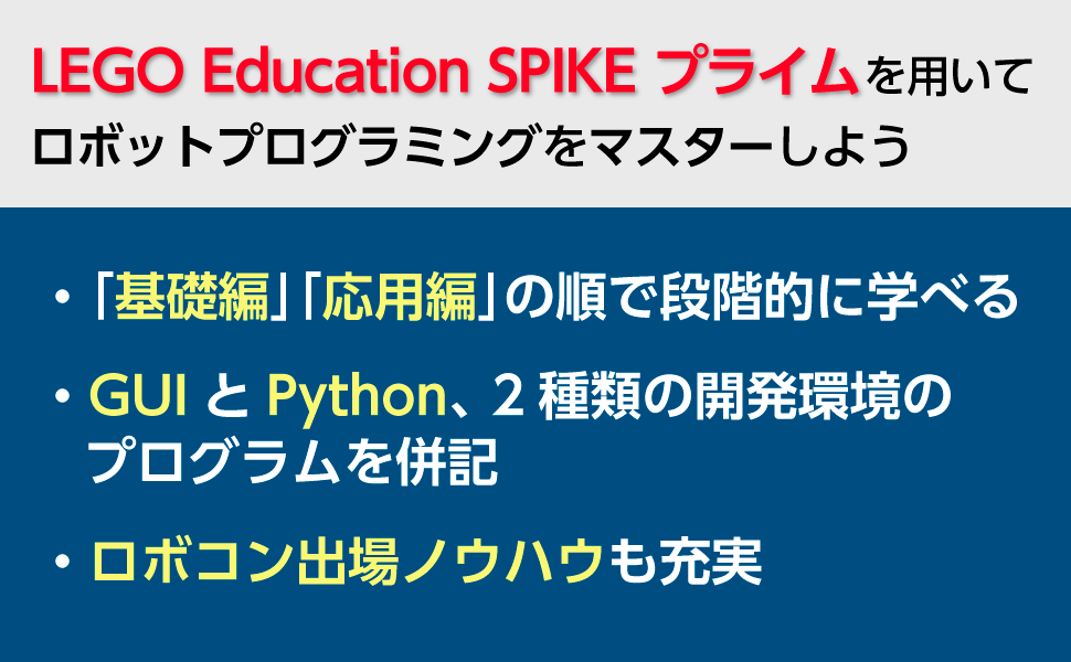 本書ではLEGO Education SPIKE プライムを用いたロボットプログラミングの方法を解説しています。初心者でも「基礎編」「応用編」の順に学習を進めていくことで、ロボットプログラミングを段階的にマスターできるよう構成。GUIプログラムとPython言語の開発環境が用意されているため、本書でも2種類のプログラムを併記しました。第4版は実践的なPythonプログラムの使い方であるリストやクラス定義などを新たに追加し、実際のロボットプログラムが理解できる内容になっています。