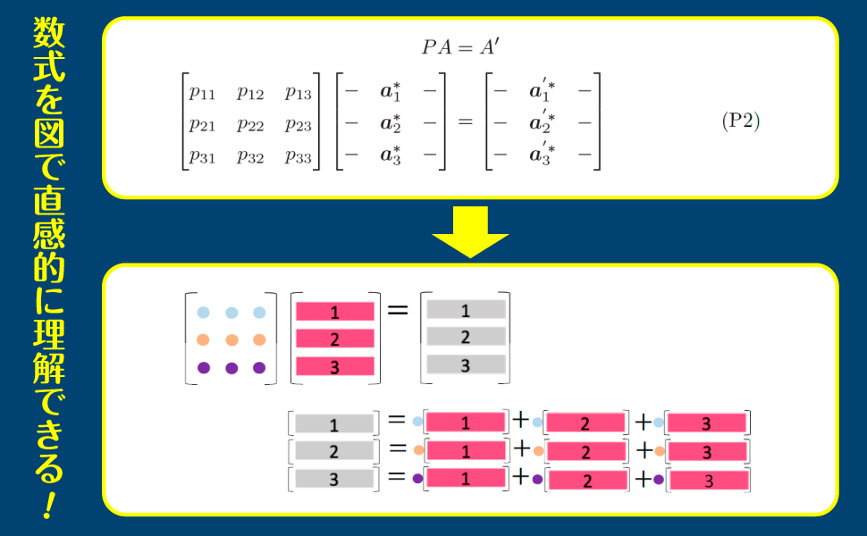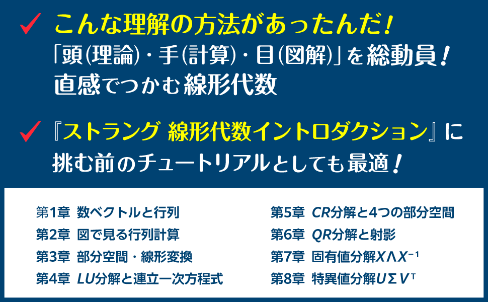 本書は、頭(理論)と手(計算)と目(図解)の3要素を軸に、線形代数の本質を直感的にマスターすることを目指した入門書です。本書の核となるのは、線形代数の世界を俯瞰する地図としての「4つの部分空間」と、実用上極めて重要な「5つの行列分解(LU、CR、QR、固有値、特異値分解)」です。各章では、まず具体的な例題から入り、定理の詳述と図解による直感的な解説を交えることで、着実にステップアップできる構成となっています。特に、行列のランクの性質を鮮やかに解き明かすCR分解や、現代の機械学習・データサイエンスの基盤となる特異値分解(SVD)を本書のハイライトに据えており、通読する中で学んだ知識が一つに繋がる「Aha体験」を提供しています。MITの名物教授Gilbert Strang博士との交流から着想を得た図解によって、線形代数の新たな発見と深い納得感をもたらす一冊です。