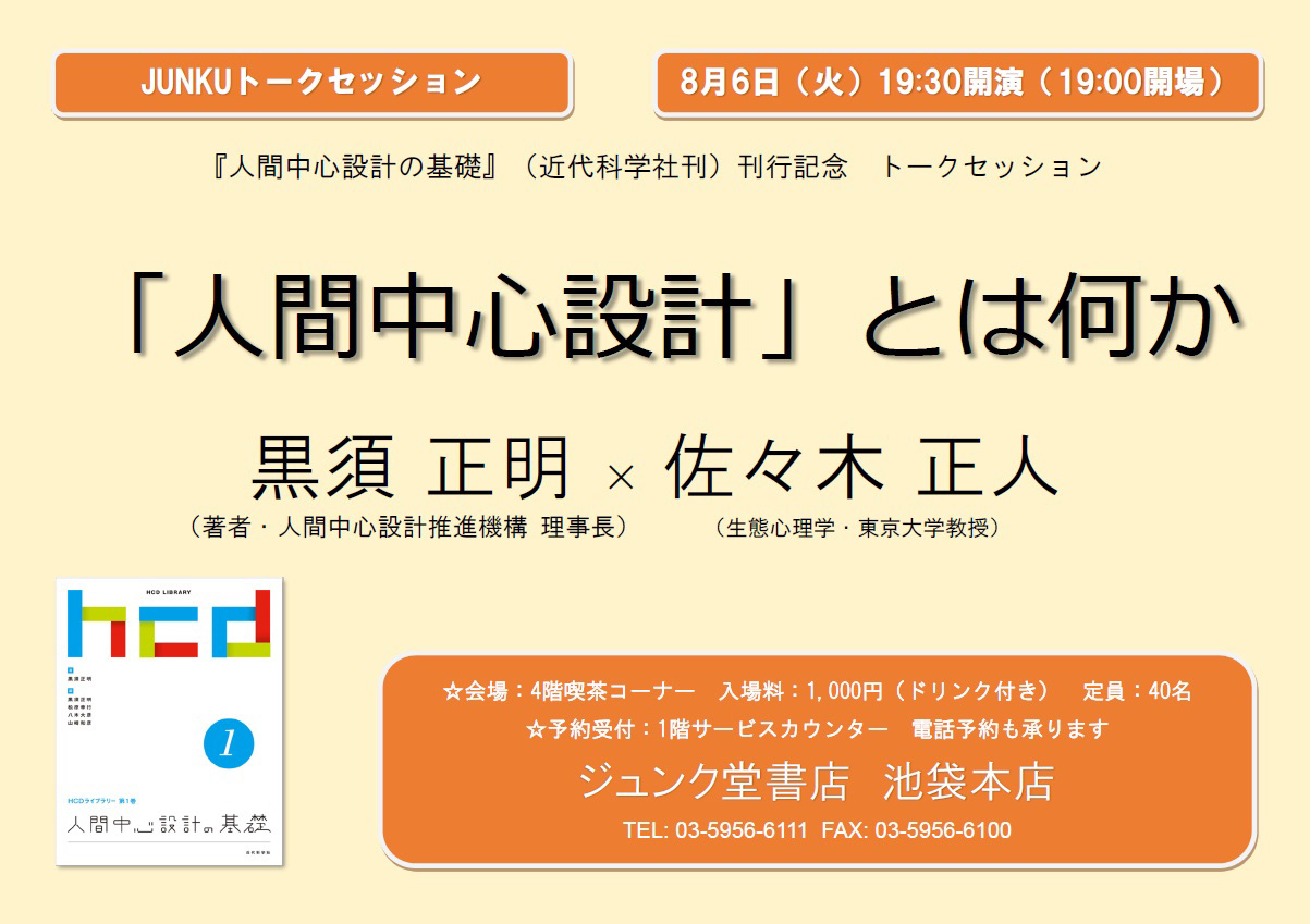 押すのか引くのか分からないドア、意味不明のエラーメッセージを出すパソコン、……。こんな経験で困ったことはありませんか? 「人間中心設計」は、このような事が起きないよう、「人間」を中心に据えて様々なものを作っていこうという考え方です。では、具体的にどう設計すると「人間中心」になるのでしょう? それは、黒須正明先生と、「アフォーダンス」研究の第一人者である佐々木正人先生のトークセッションで解き明かされます。設計に携わる方はもちろん、「もの」の使い方や、「人」と「もの」との関係に興味のある方に、ぜひ聞いていただきたいトークイベントです。